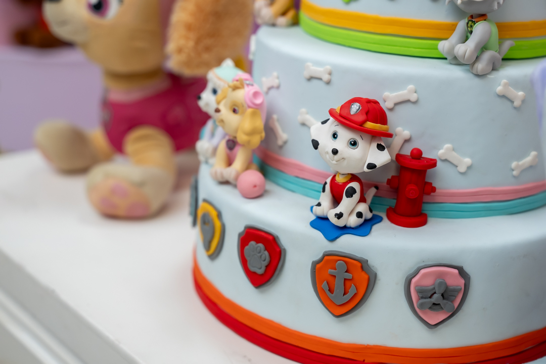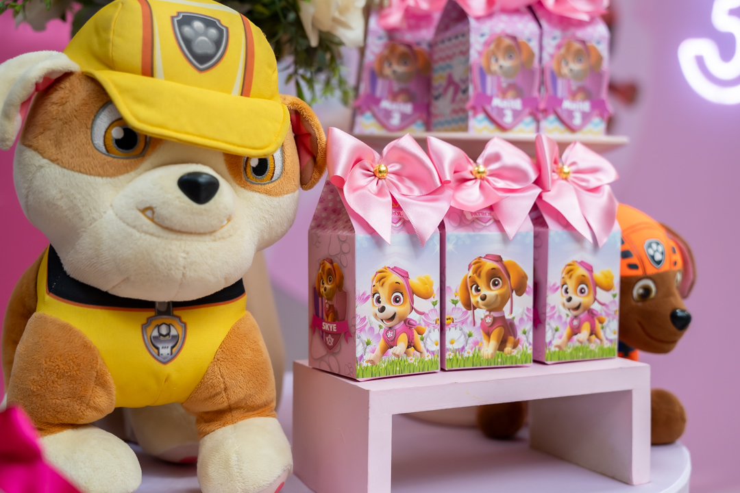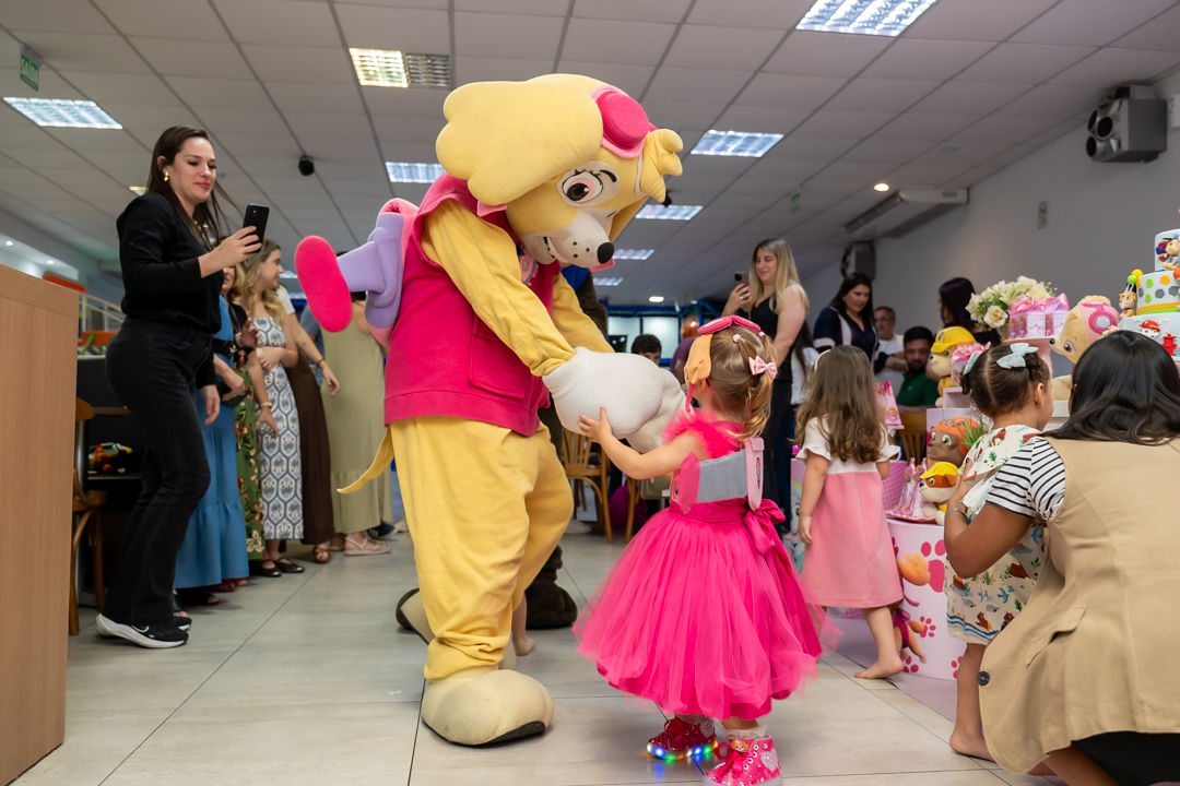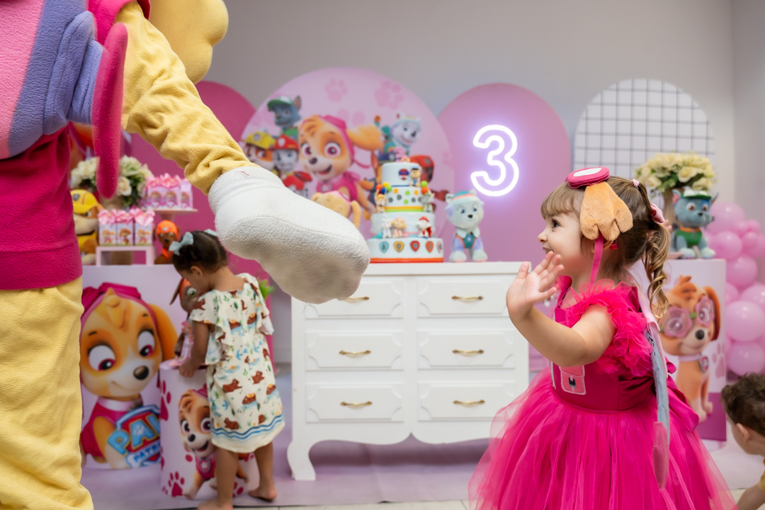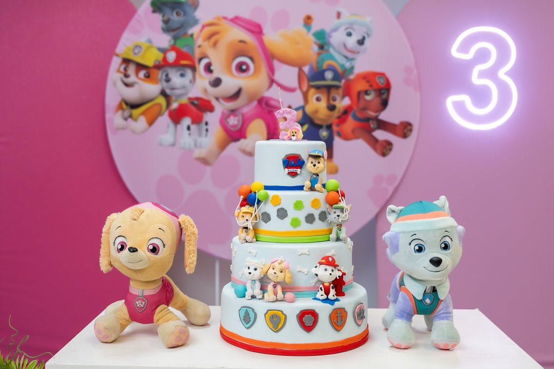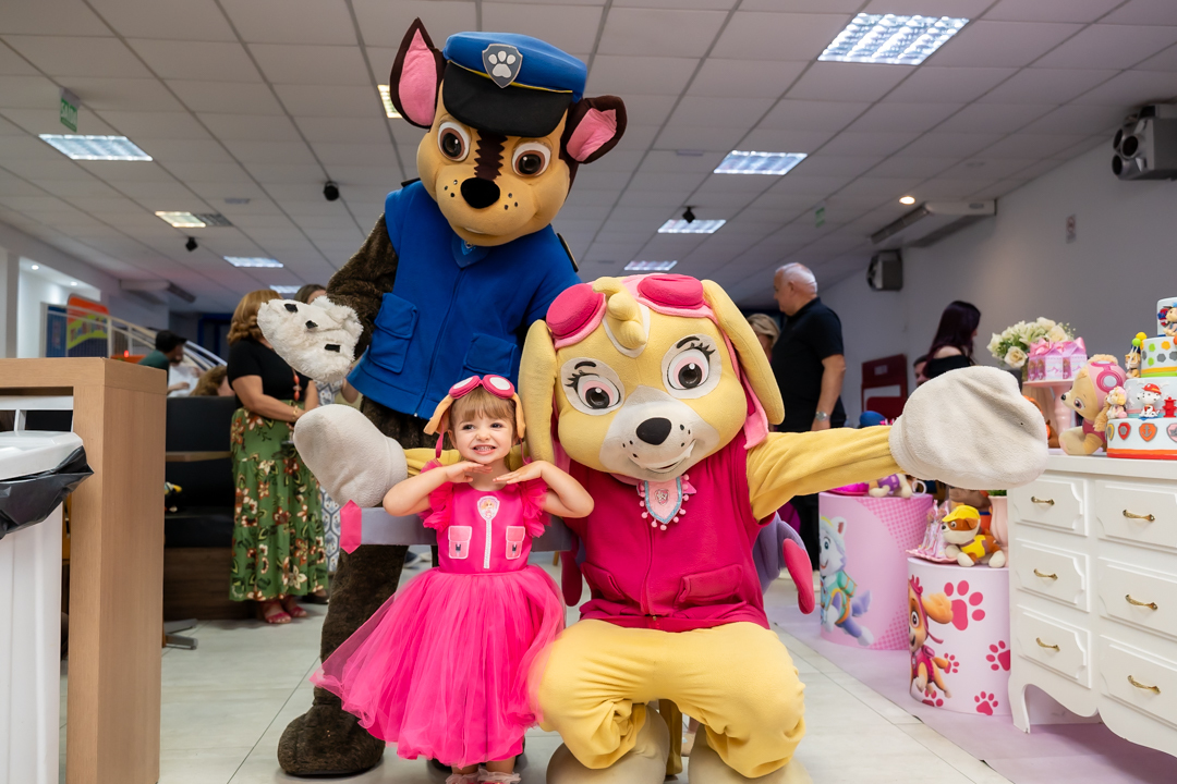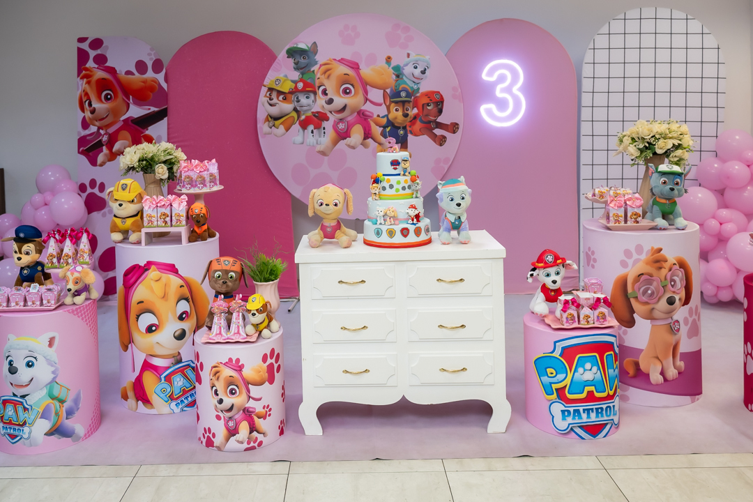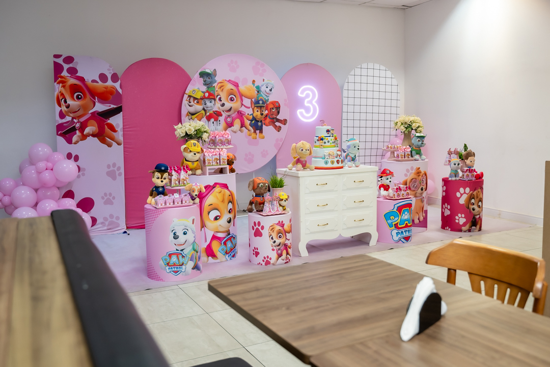 Com o tema Patrulha Canina, a decoração estava linda — e a alegria ficou completa com a visita surpresa dos personagens Chase e Skye.