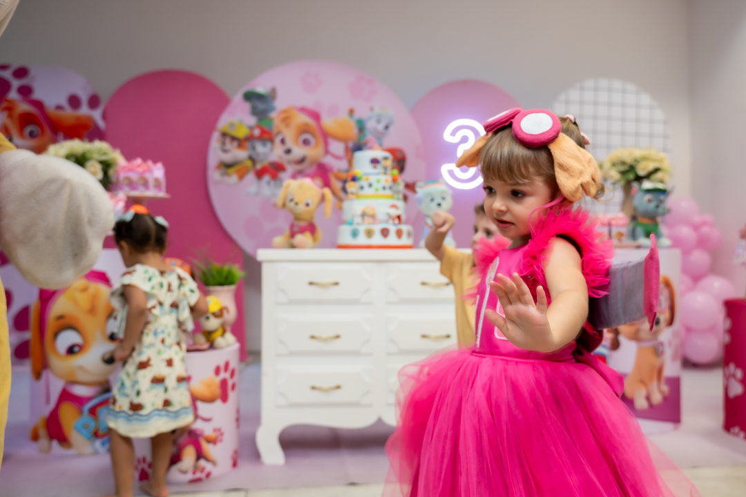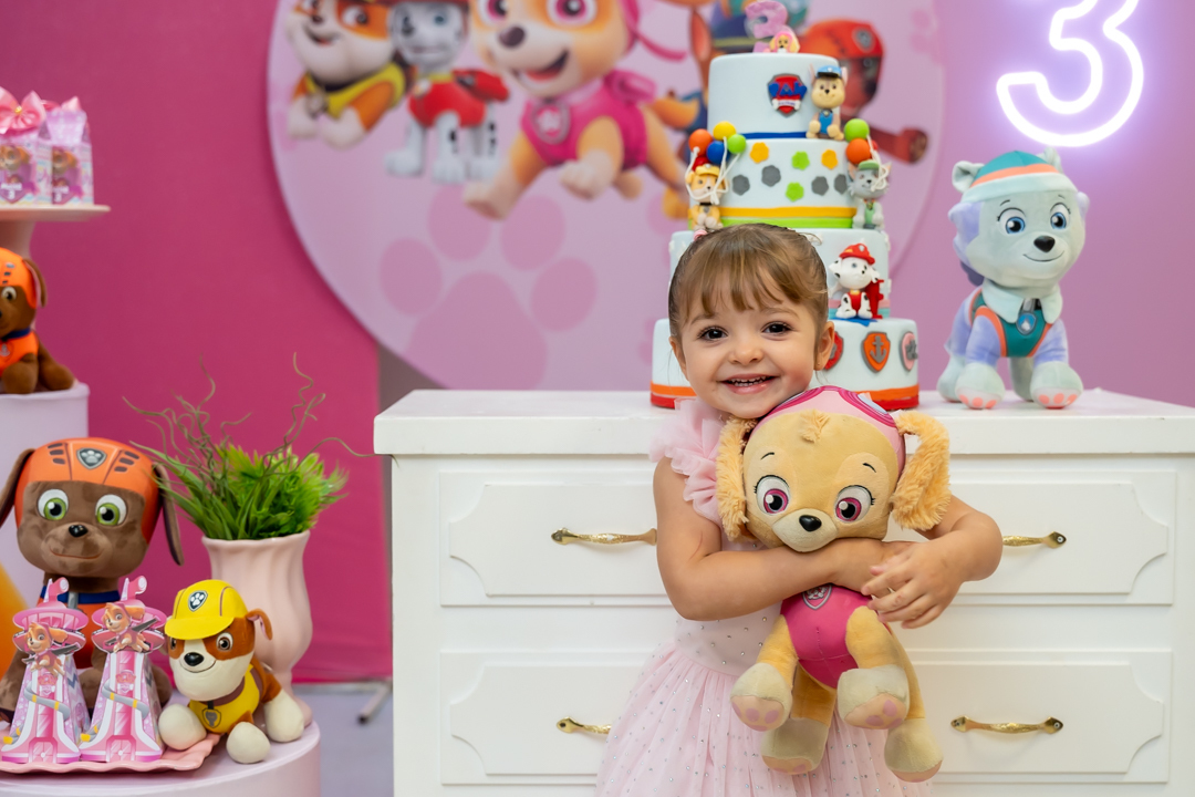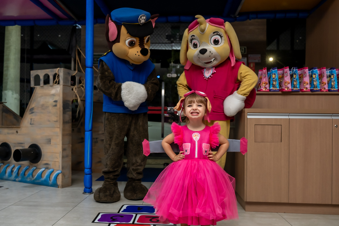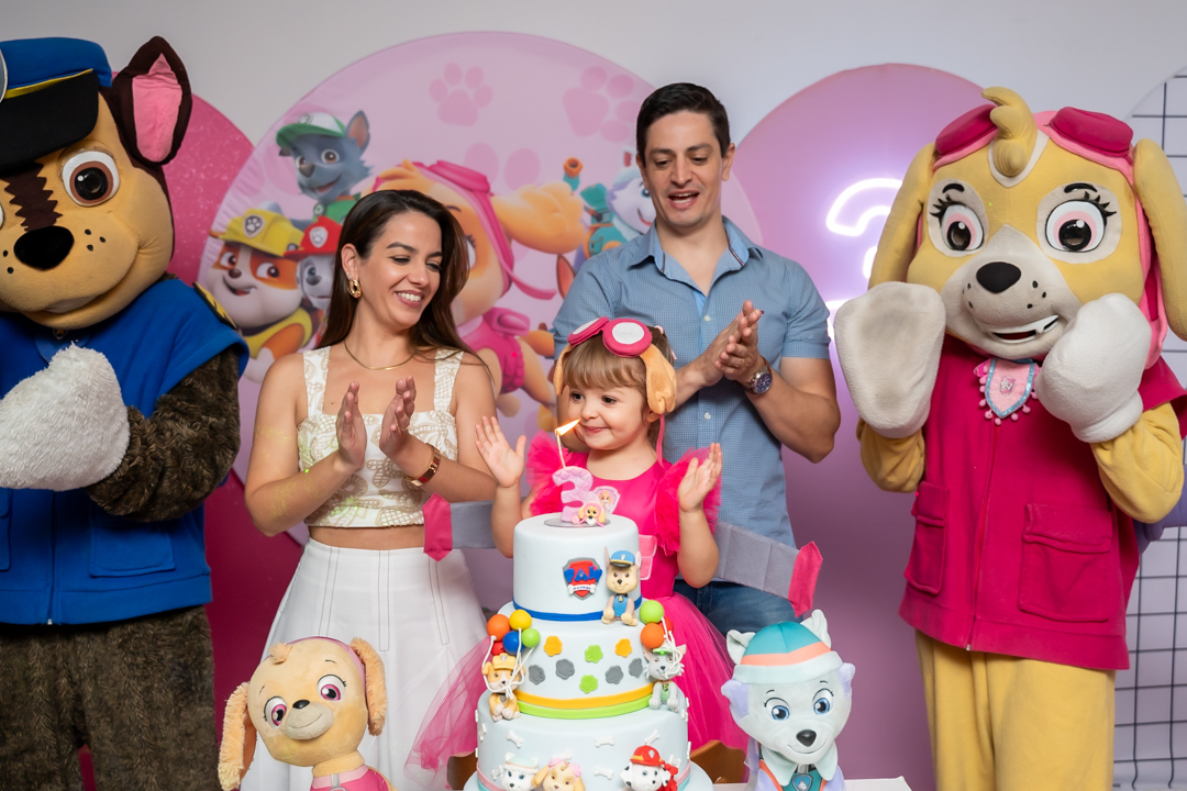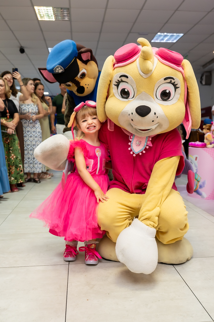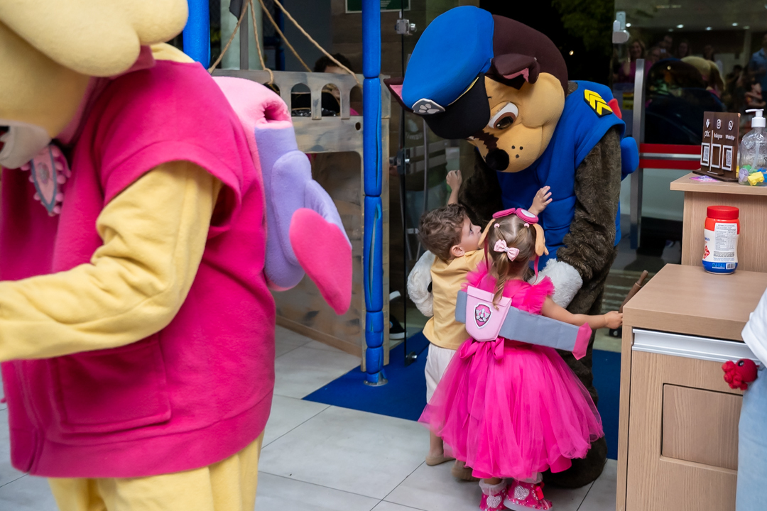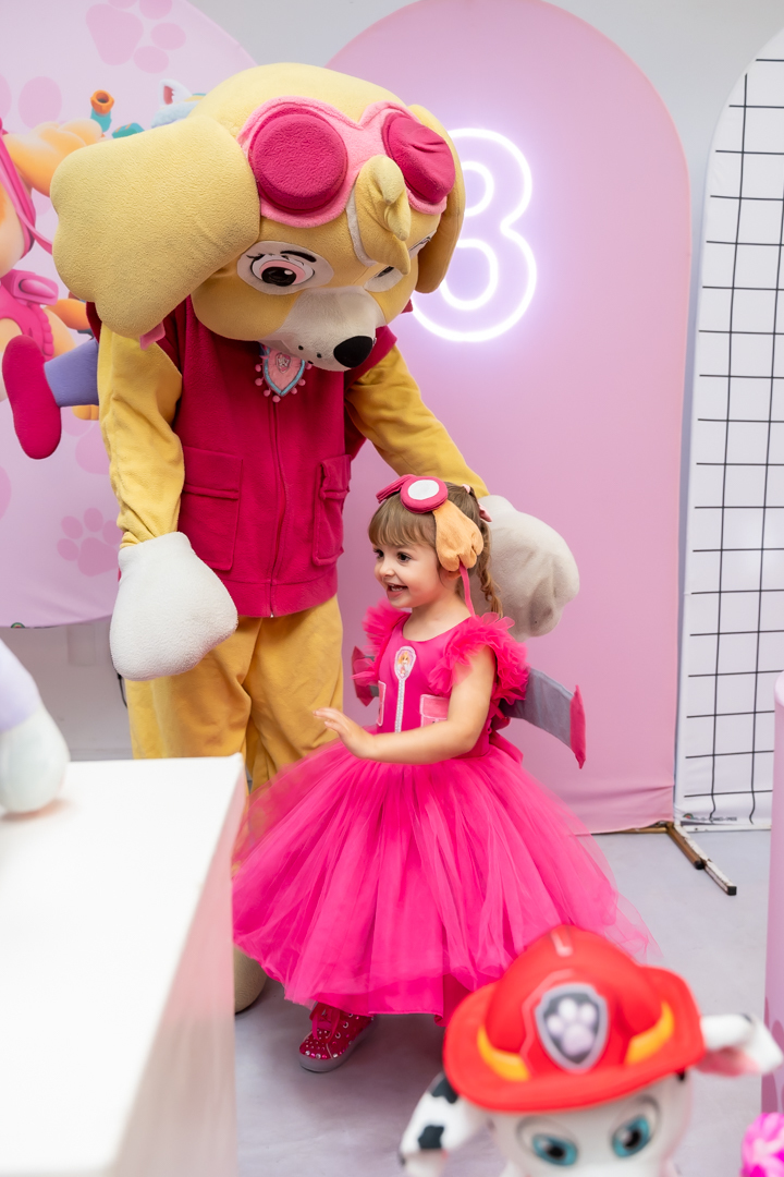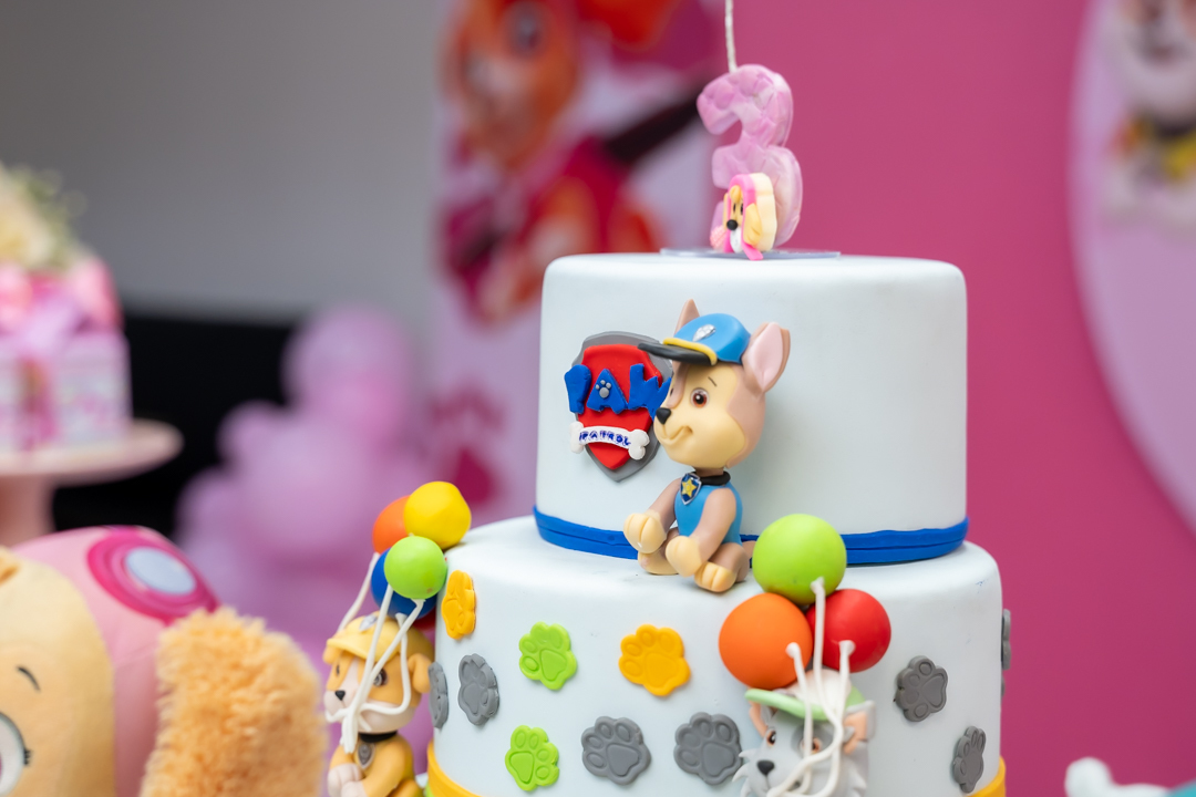 Com o tema Patrulha Canina, a decoração estava linda — e a alegria ficou completa com a visita surpresa dos personagens Chase e Skye.