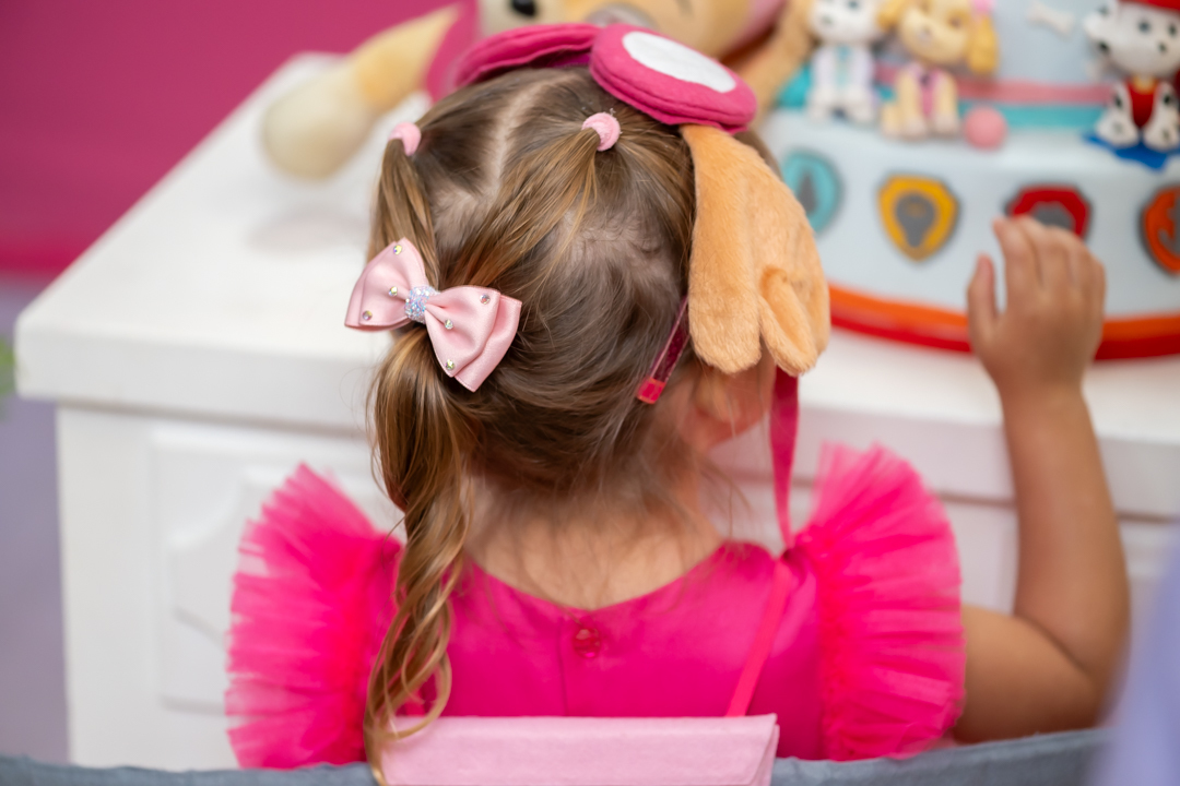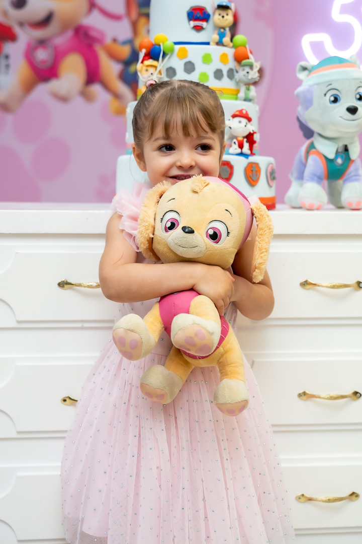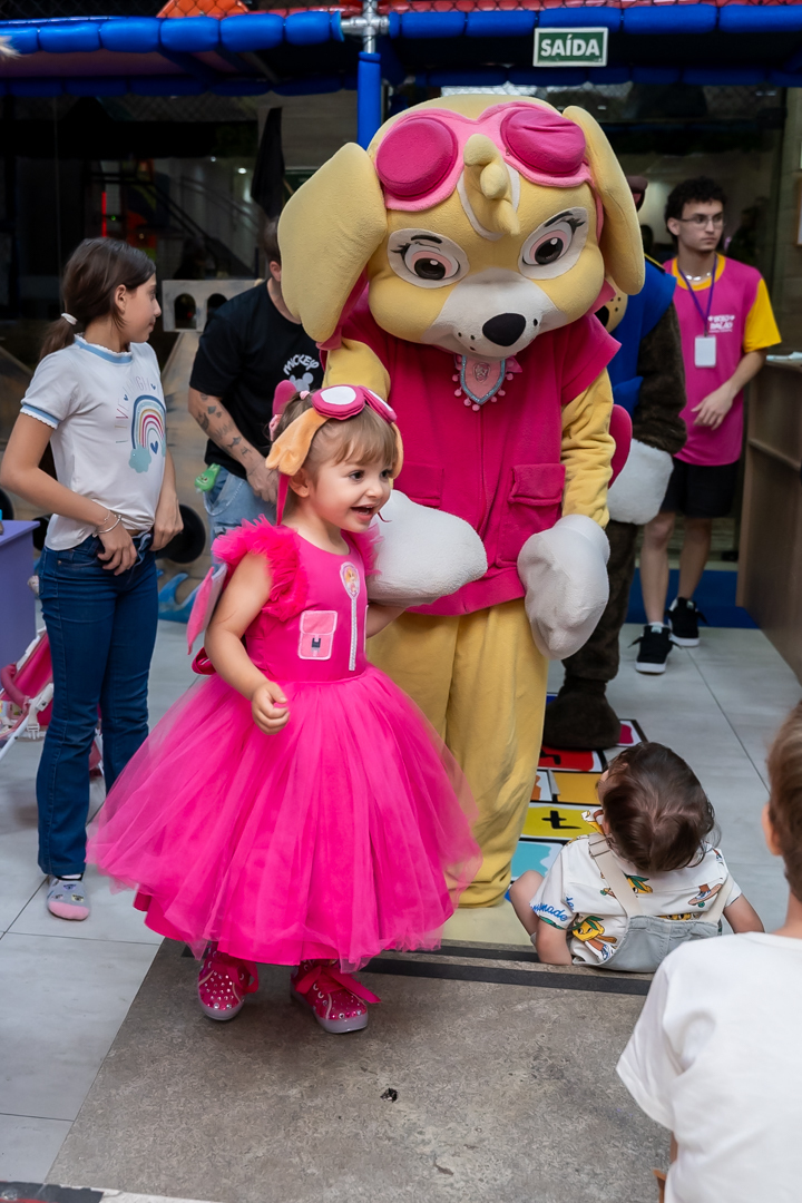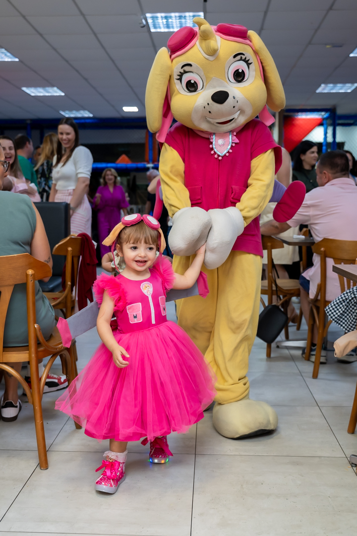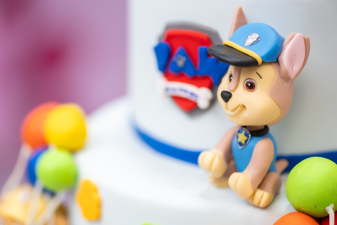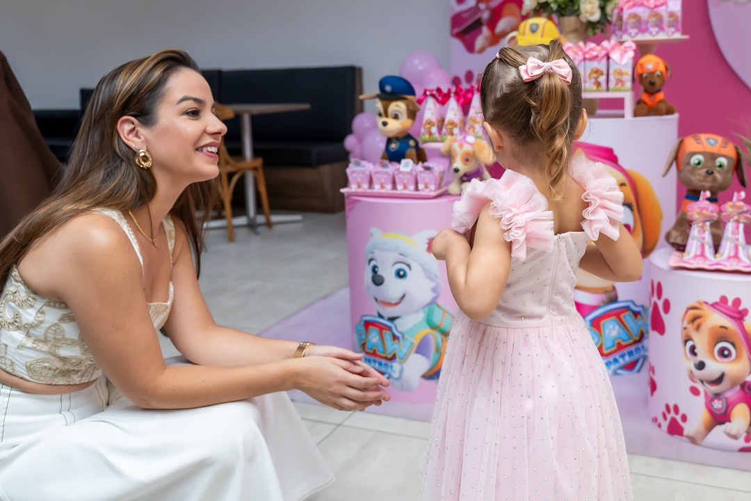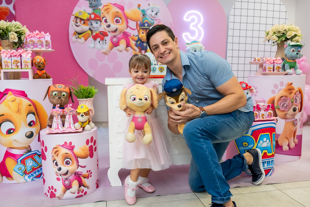 Com o tema Patrulha Canina, a decoração estava linda — e a alegria ficou completa com a visita surpresa dos personagens Chase e Skye.