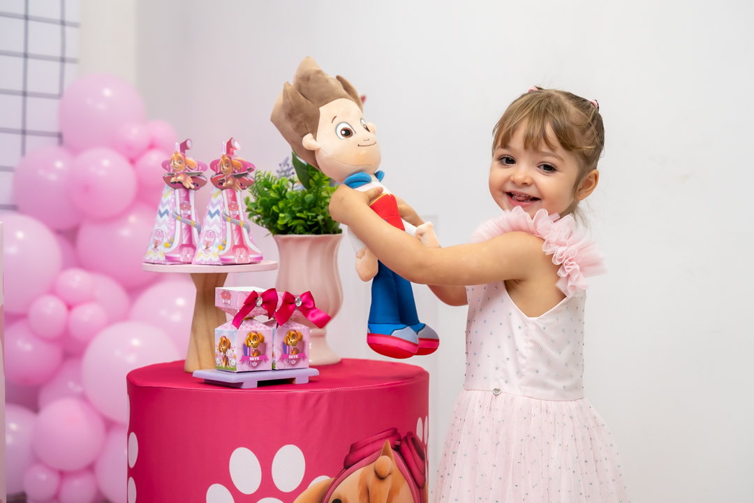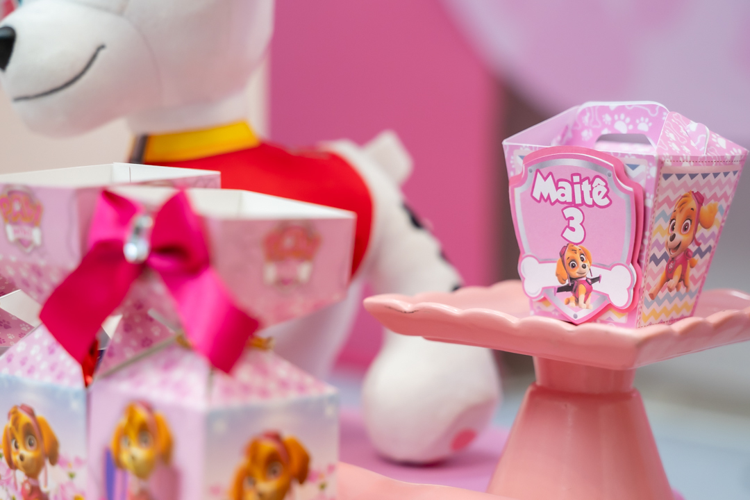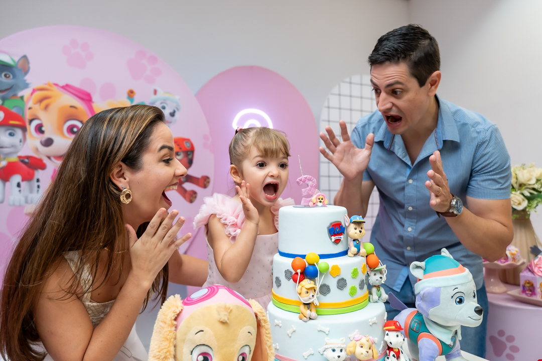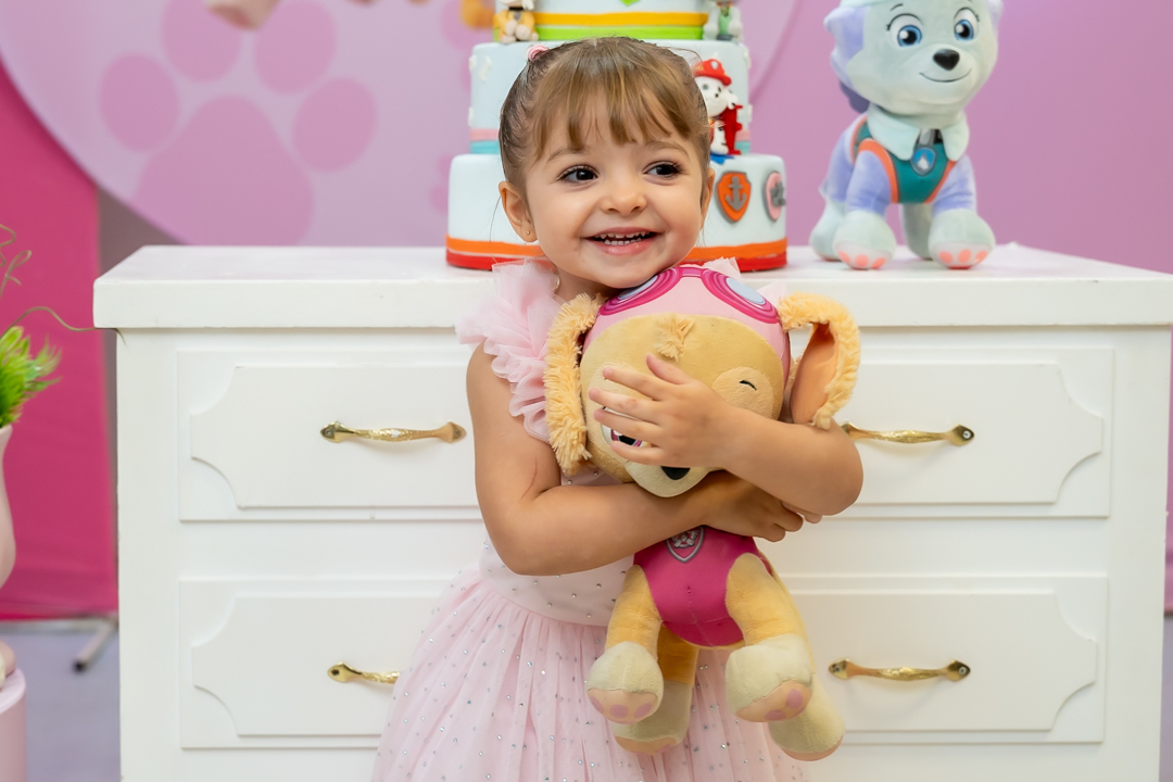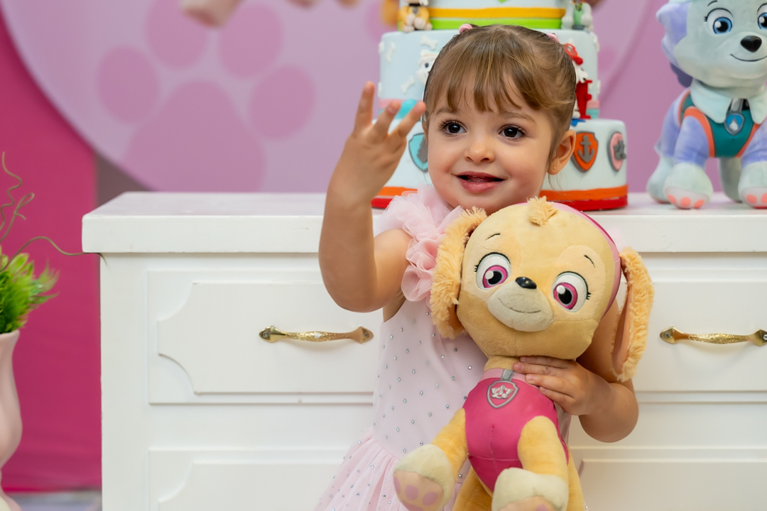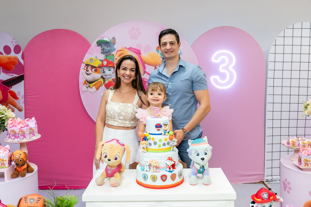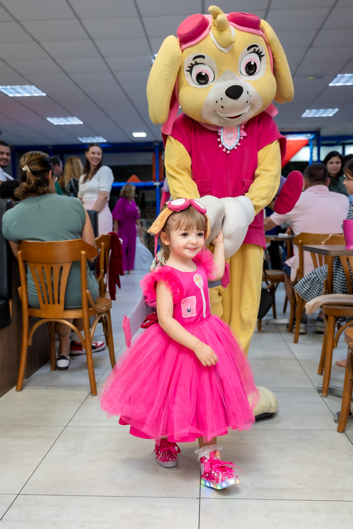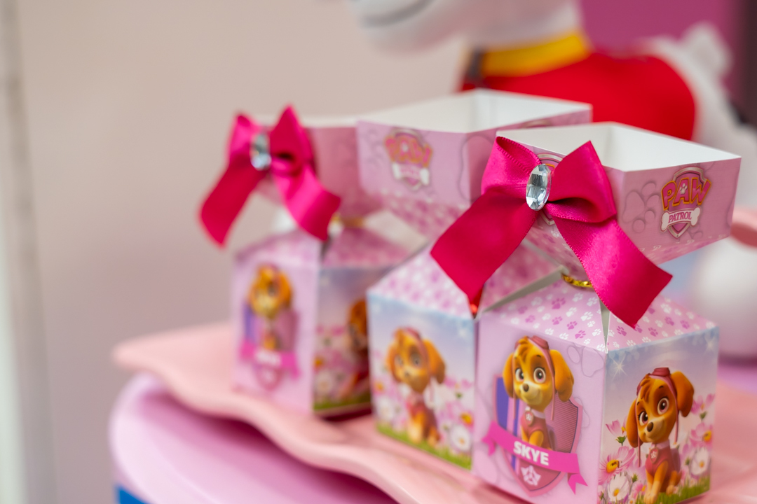 Com o tema Patrulha Canina, a decoração estava linda — e a alegria ficou completa com a visita surpresa dos personagens Chase e Skye.