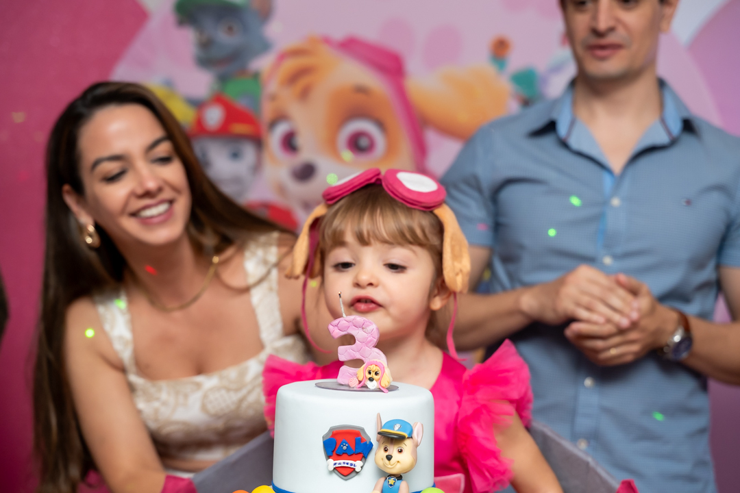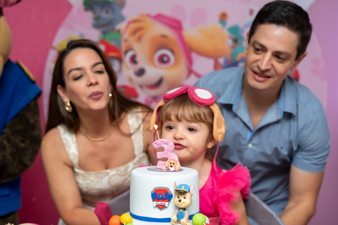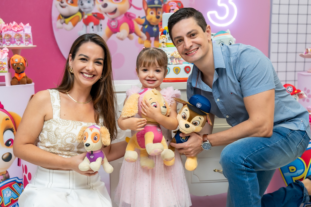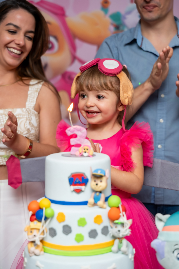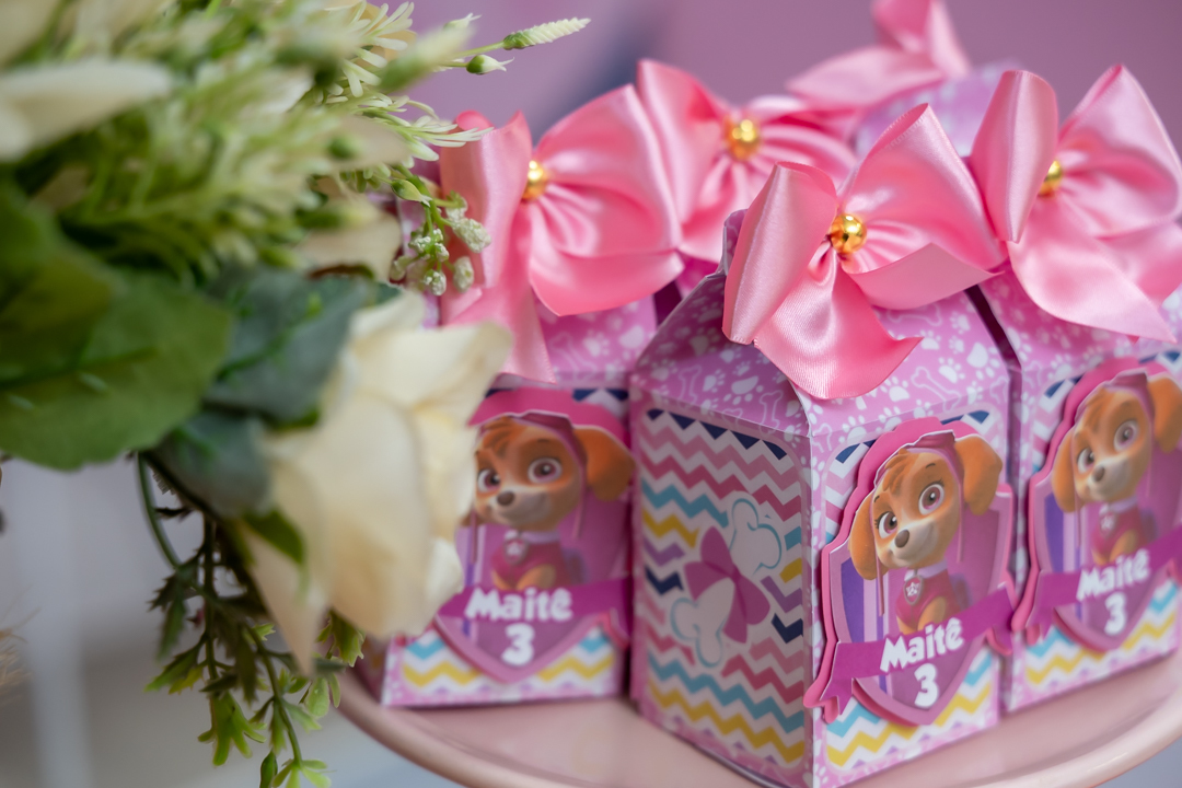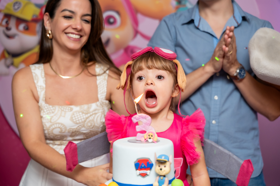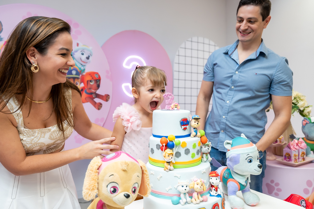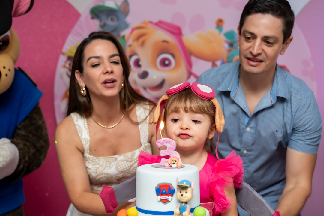 Com o tema Patrulha Canina, a decoração estava linda — e a alegria ficou completa com a visita surpresa dos personagens Chase e Skye.