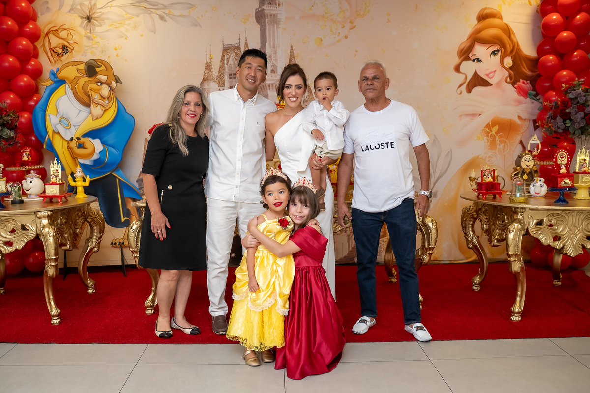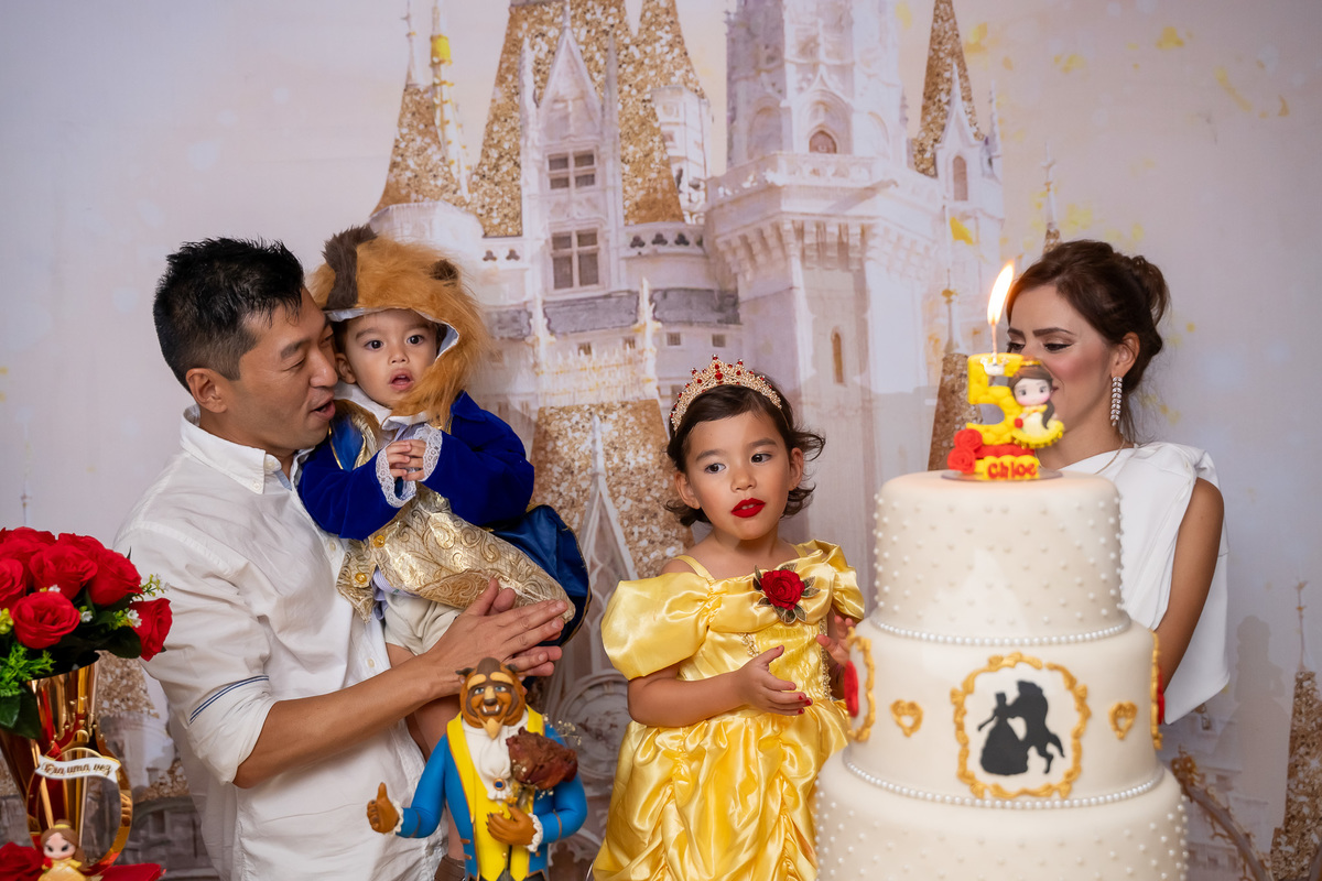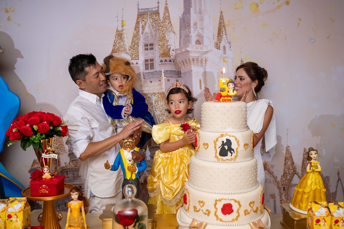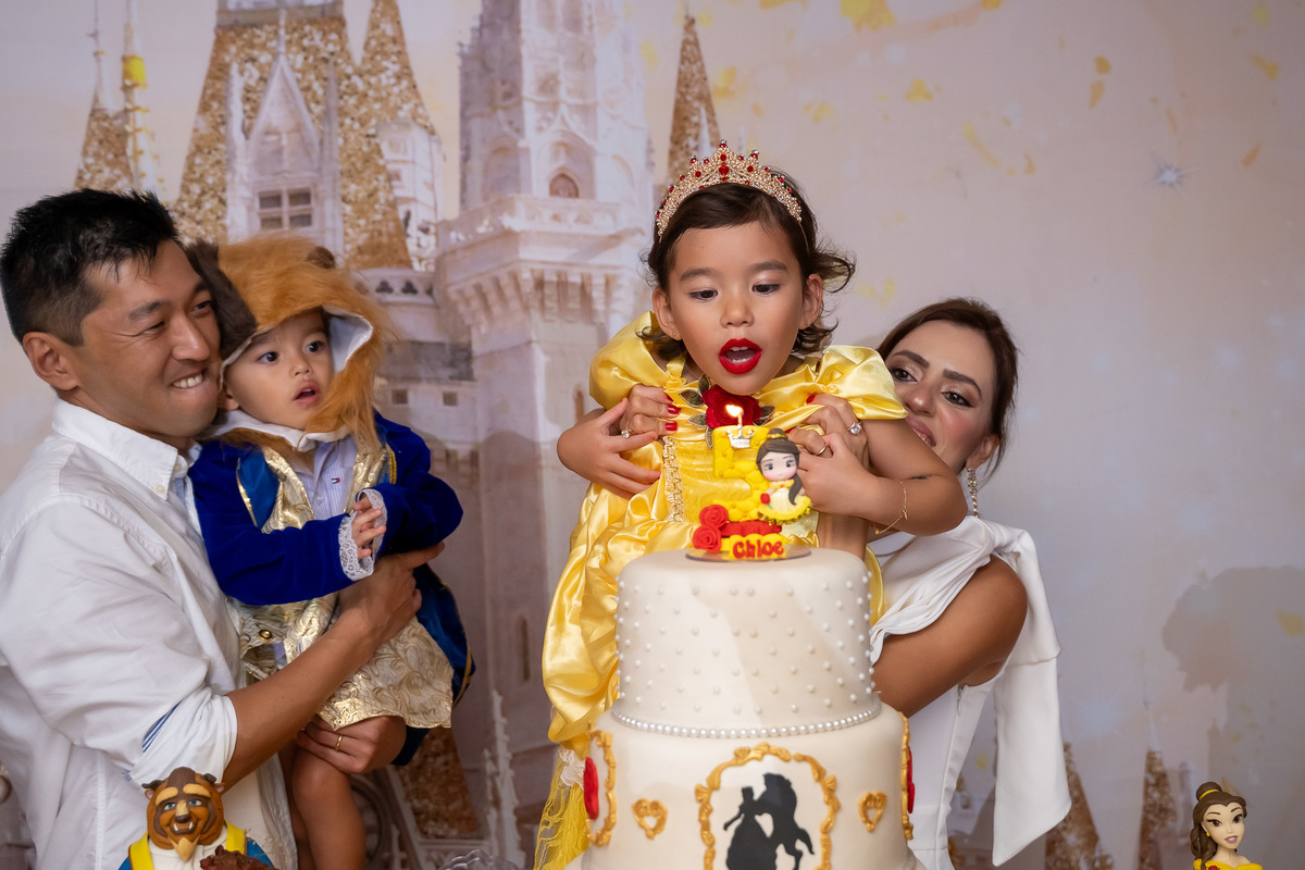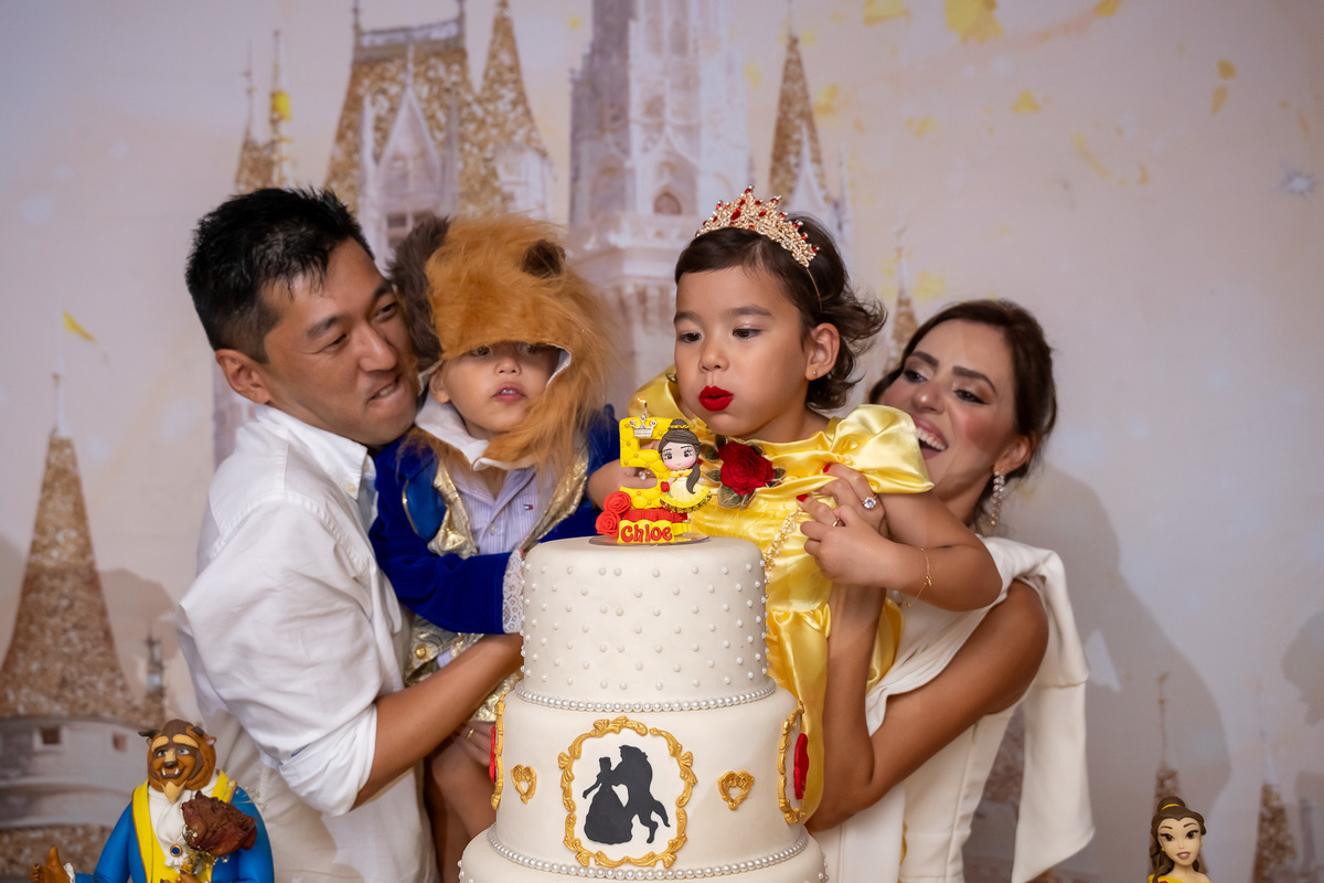 Na hora do parabéns, a magia ficou ainda mais especial: o príncipe se transformou em uma linda Fera e ajudou a assoprar as velinhas ao lado da Chloe, da mamãe Karen e do papai Eduardo. Um momento cheio de amor e emoção!
