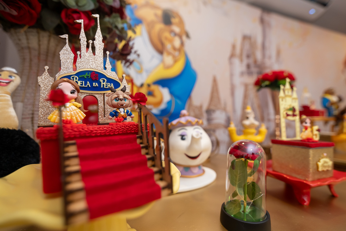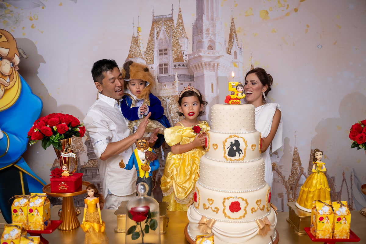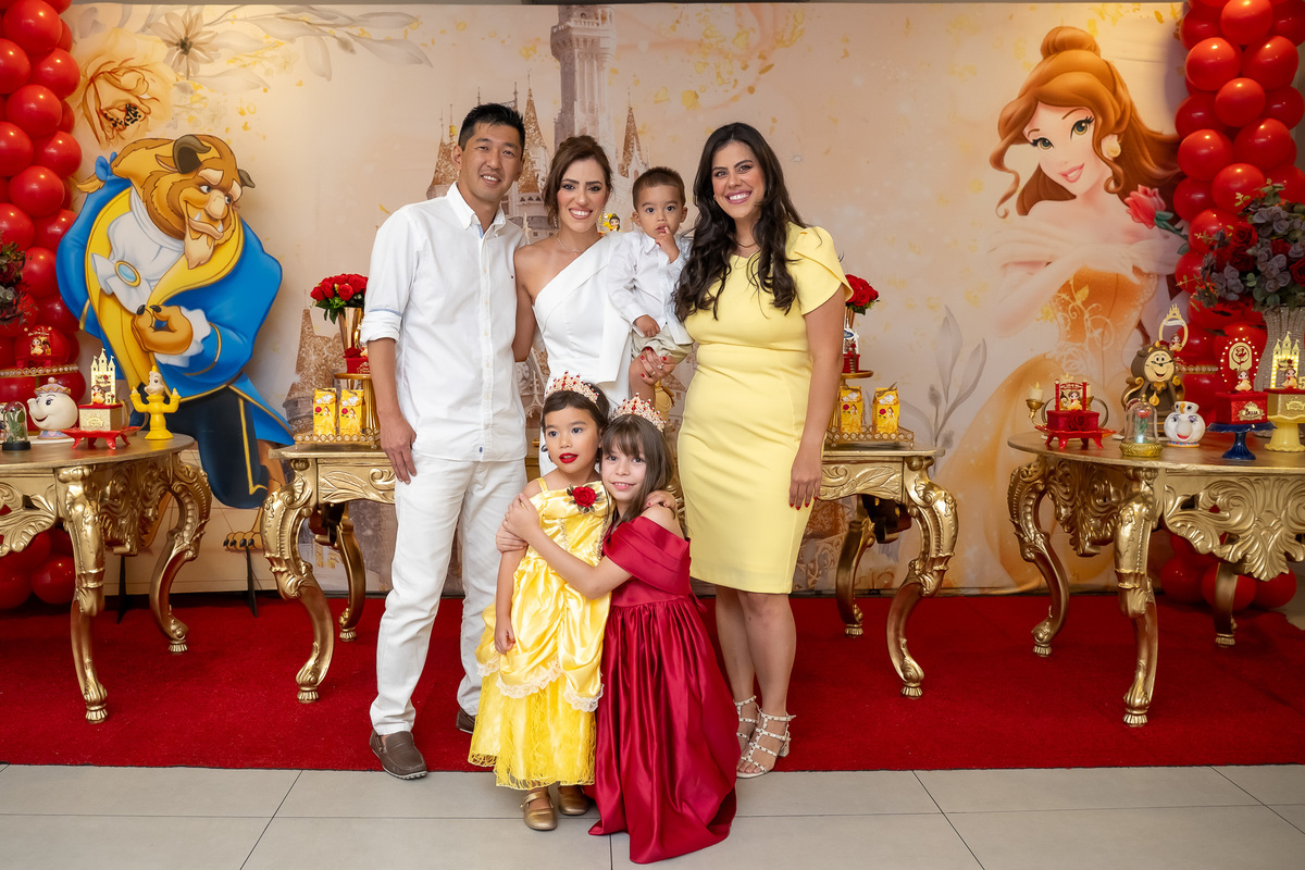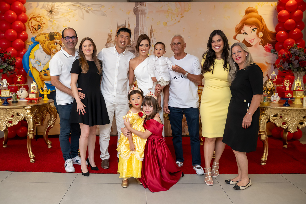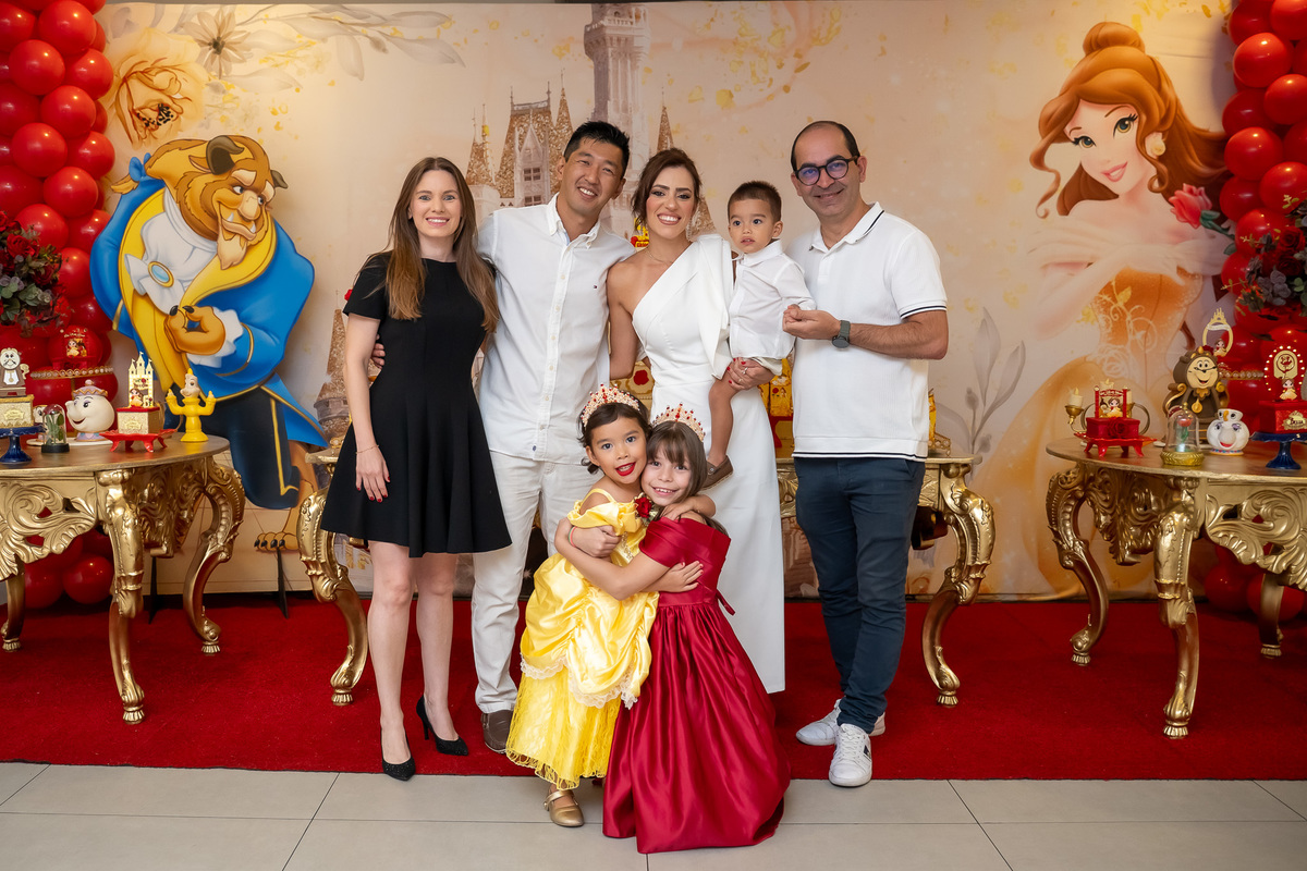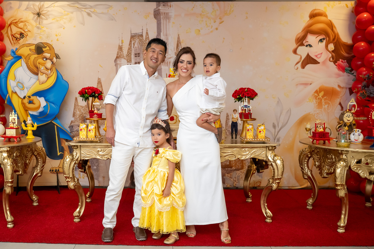 Na hora do parabéns, a magia ficou ainda mais especial: o príncipe se transformou em uma linda Fera e ajudou a assoprar as velinhas ao lado da Chloe, da mamãe Karen e do papai Eduardo. Um momento cheio de amor e emoção!