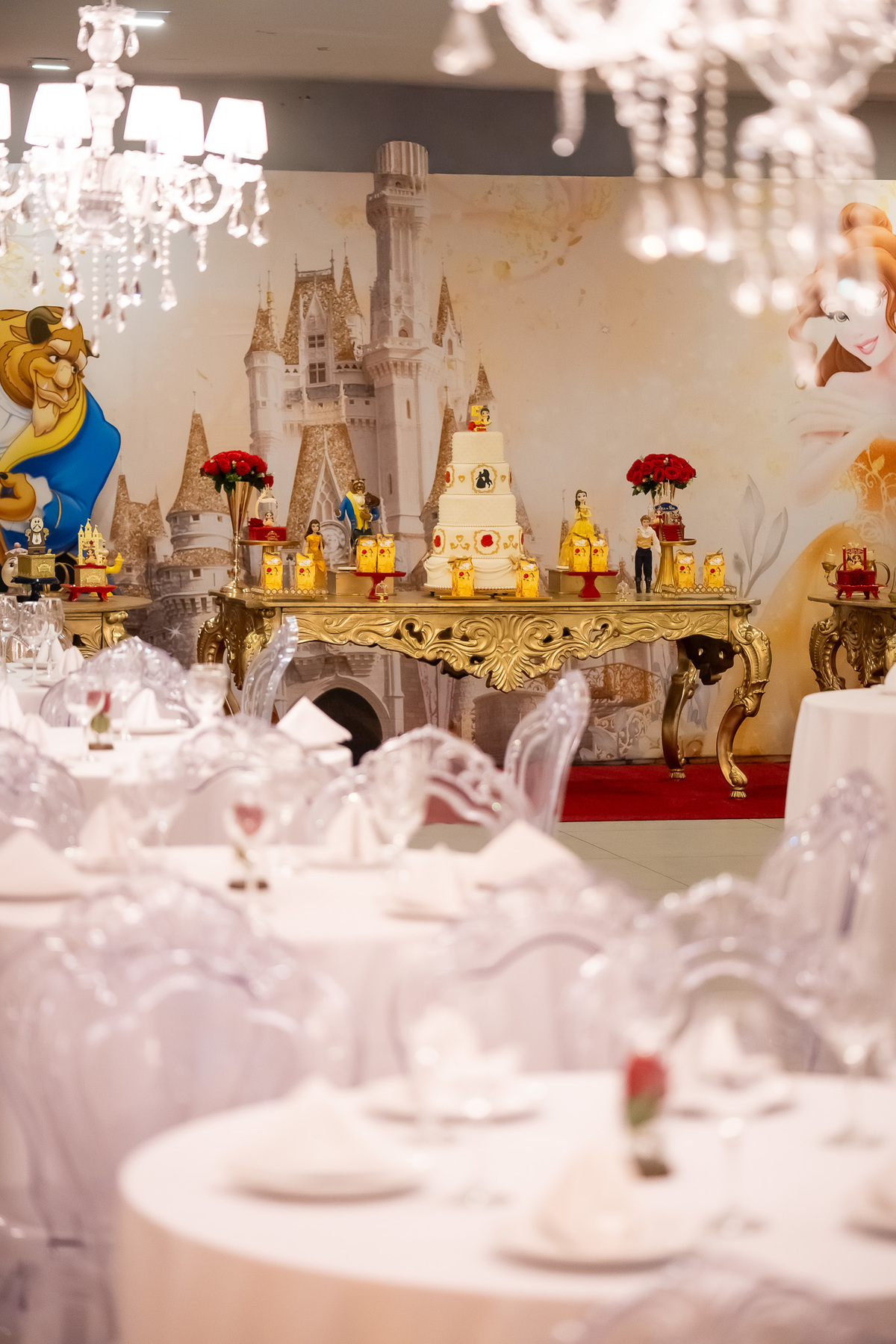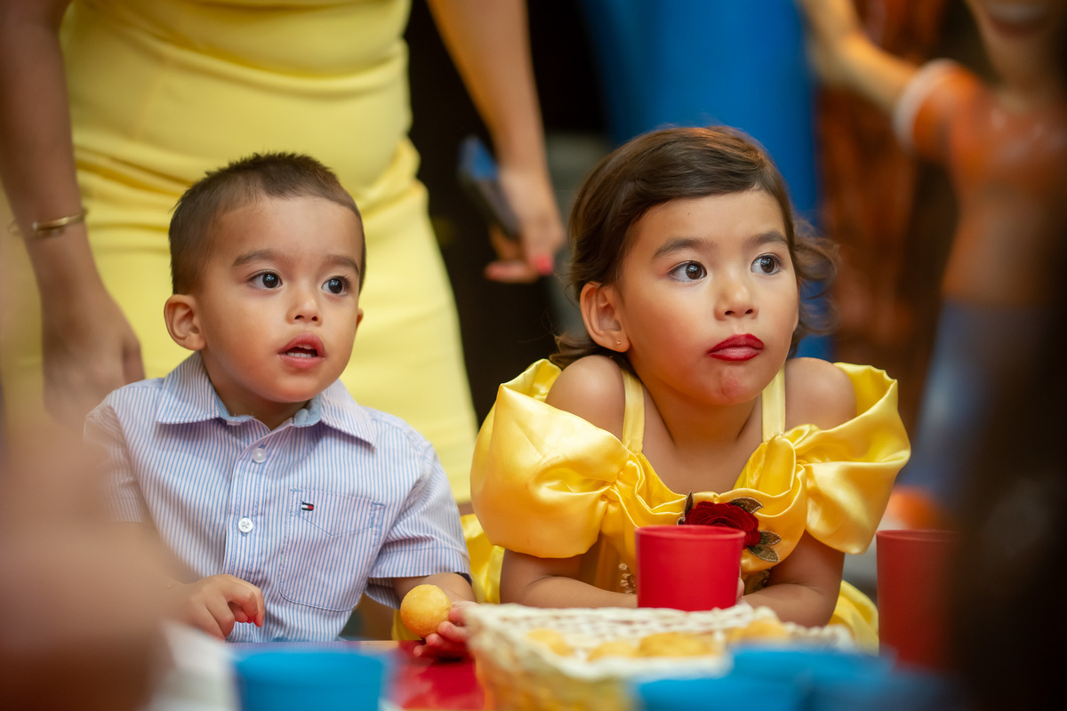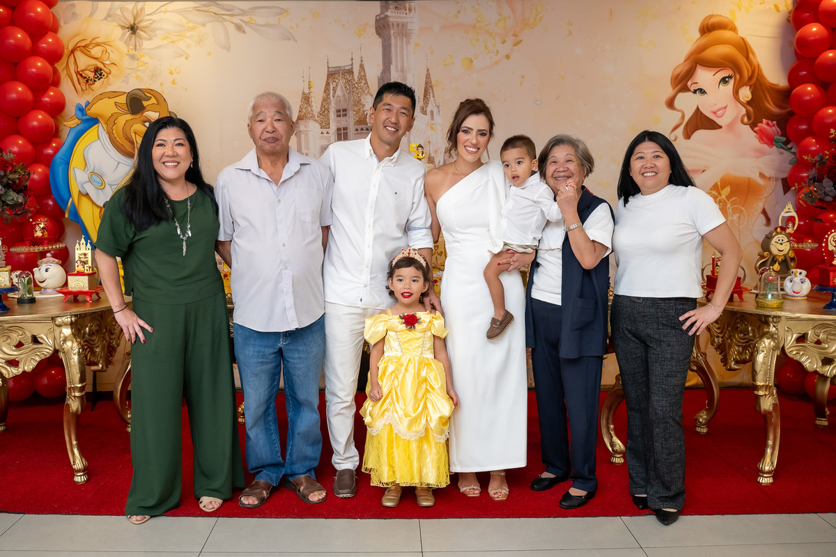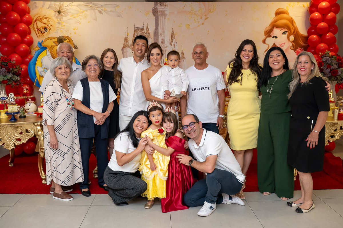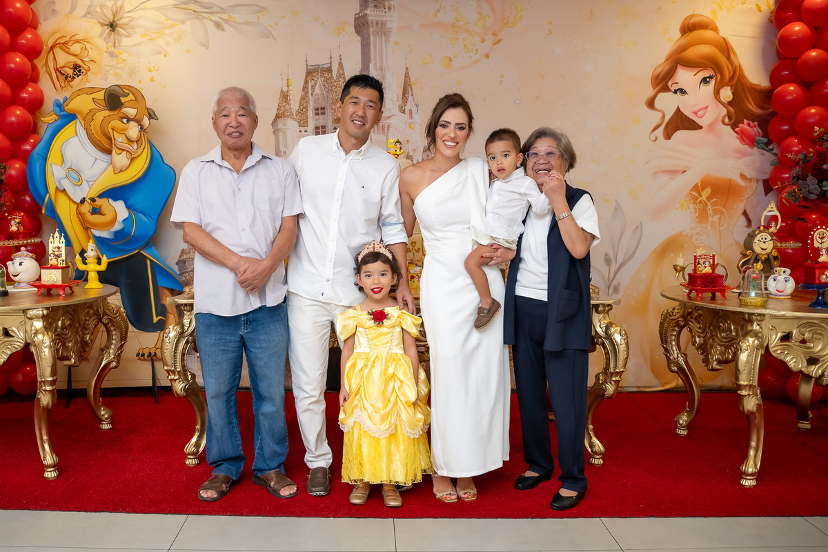 Na hora do parabéns, a magia ficou ainda mais especial: o príncipe se transformou em uma linda Fera e ajudou a assoprar as velinhas ao lado da Chloe, da mamãe Karen e do papai Eduardo. Um momento cheio de amor e emoção!