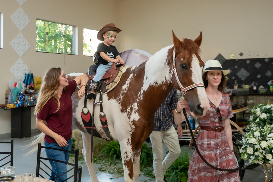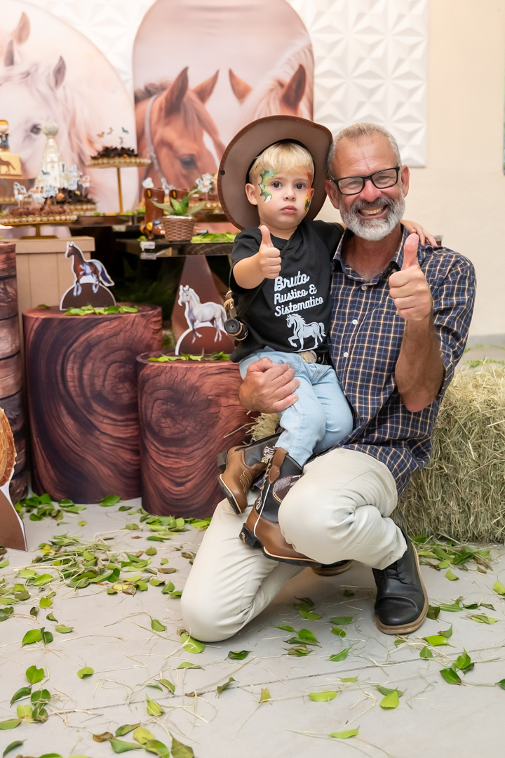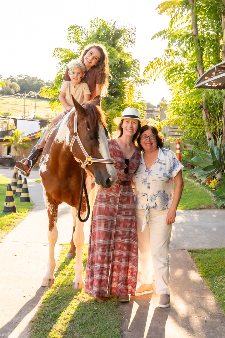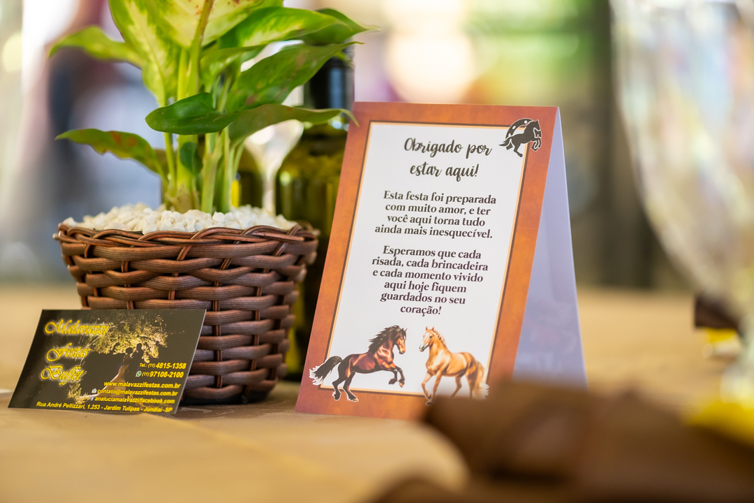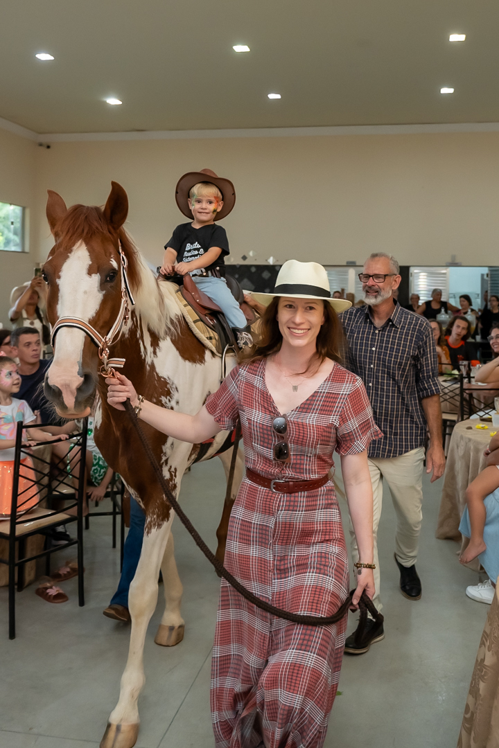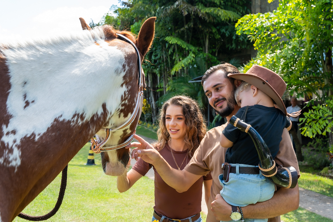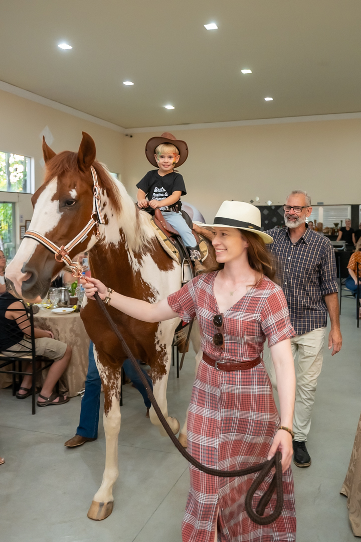 E para tornar tudo ainda mais inesquecível, pouco antes do parabéns, Vicente fez uma entrada triunfal montando o lindo cavalo malhado, o indiano Jarc — um verdadeiro espetáculo que emocionou e arrancou aplausos de todos. 🌟